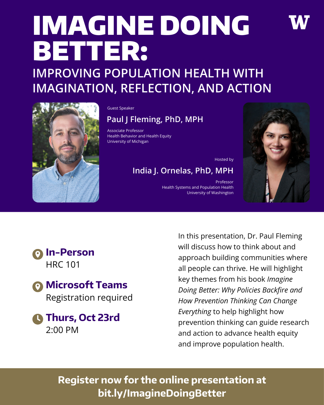 The Department of Health Systems and Population Health periodically hosts seminars, expert panel discussions, author conversations and workshops to explore concepts and ideas to deepen the conversation surrounding public health and health services leadership. These events are typically open to students, alumni, faculty and staff of the department, as well as other professionals in the field. Events are held both online and in-person on our campus.