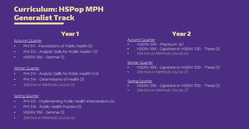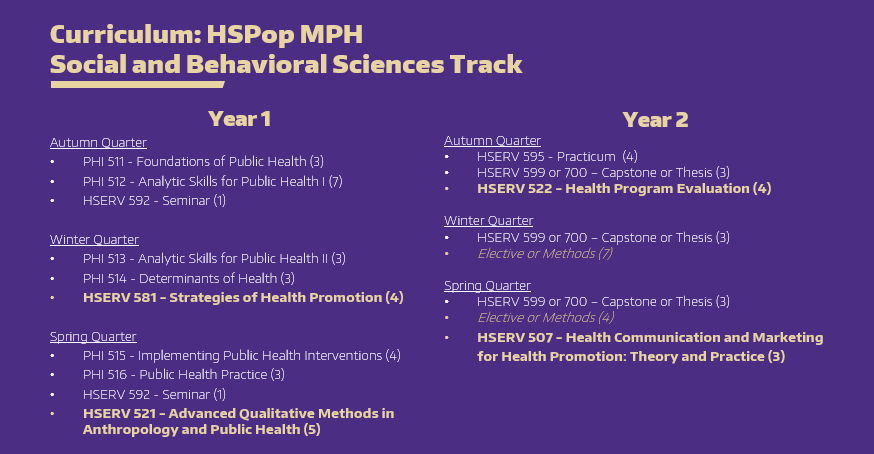 HSPop MPH students are required to take two quarters of program seminar (offered autumn and spring).